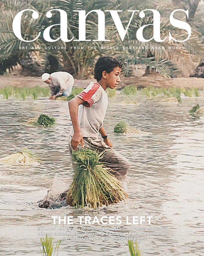 Our cover features Mohammad Alfaraj’s Glimpses of Now (2015–), part of a video project in which the Saudi artist compiles footage taken over several years of filming on phone and camera across the country. The fleeting nature of the image, reinforced by the almost out-of-focus element captured in the movement of the boy wading through water, speaks to this issue, The Traces Left, which maps the always-shifting yet enduring relationship between humans and their natural habitat, examining the marks that each leaves on the other.