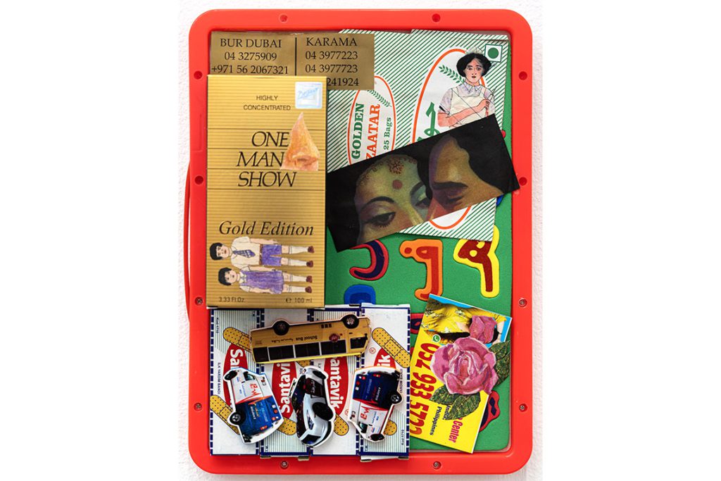 Similarly, Bady Dalloul’s collage-based miniature work One Man Show (2024) conjures up the everyday textures of life in old Dubai: golden phone numbers in Karama, yellow schoolbuses, taxis, garish little cards you find scattered on the streets, a Golden Zaatar packet and a cutout of covert lovers from old Bollywood cinema. It is a neatly framed nostalgia box. Throughout the show, work by artists like Dalloul and Al Qasimi prioritise capturing these contradictions of daily life in the UAE and the wider region, for those whose lives have been filled by them.