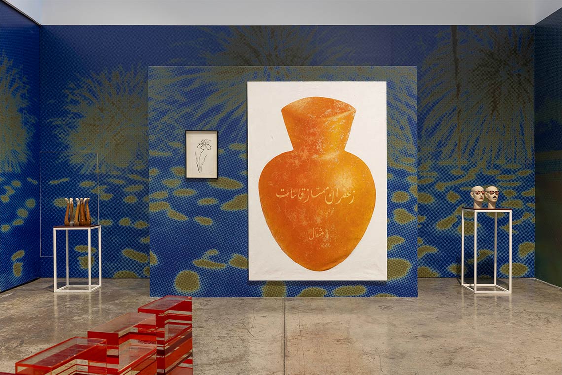 Shirin Aliabadi’s Girls in a Car (2005) turns a camera flash into a spotlight on young girls from the Iranian urban middle class during a traffic jam, made up for a night out. It subverts the paparazzi images we are used to seeing of young Western female celebrities having their fun. It is also a portrait of a time, one that resonates anew in the context of the recent Woman, Life, Freedom protests in Iran. Egyptian artist Huda Lutfi’s Lipstick and Mustache (2010) comprises two sculptural busts modelled off her own head; one masculine, one feminine, both wearing sunglasses with lenses that have been replaced with images of soldiers. The work is playful yet snarkily referential to gender politics and military and state power. Hayv Kahraman’s paintings are ever-strong and it is a treat to discover some of her earlier work, particularly its influences from Japanese woodblock prints (Ukiyo-e). There are those who we have recently lost –– the magnificent Tarek Al-Ghoussein, Farhad Moshiri and Monir Shahroudy Farmanfarmaian, who have classic works exemplifying their singular practices, as if to say: these giants were here.