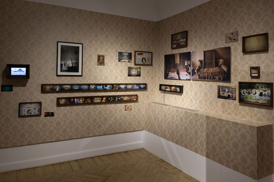 This is evident as one enters the gallery and passes the initial series of photos, introducing the artist. There is a portrait showing Baladi standing on a French-style couch, with a series of mannequin heads lined up by her feet. The photograph – by Egyptian artist Youssef Nabil – portends Baladi’s sense of playfulness and keen eye for the delightful surprises of the absurd, an eye that seems so well suited to a city like Cairo. As one takes a slight turn to the left, one encounters an entire wall done with retro wallpaper of the type seen in most bourgeois homes in 1970s Cairo (my parents’ first flat had one just like it). The colour and texture immediately set a very intimate and domestic sense of place. It is as if memories are not just associated with the places in the photos but also the very wall on which they are mounted. This notion of the materiality of the presentation of the image is central to both the exhibition and to Baladi’s practice.
