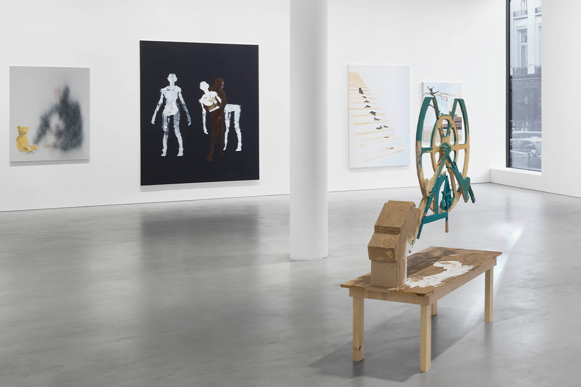 Daughter B.W.A.S.M. – the acronym standing for ‘Daughter Born Without a Shit Mom’ – takes as its departure point Francis Picabia’s 1916 Dadaist painting Fille née sans mère (Daughter Born Without a Mother), which appropriated a diagram of a steam engine, overlaying it with gold and green to satirise the mechanisation of life and the classification of machines as female. Madani brings Picabia’s two-dimensional mechanomorphic vision into our three-dimensional present, where AI has replaced steam engines as the dominant technology shaping daily existence. At Pilar Corrias, she constructs a wooden installation that mirrors Picabia’s work, predictably desecrated with smears of acrylic-painted excrement – a visual manifesto declaring that the idealisation of the mechanical, the perfect and the pristine remains fundamentally at odds with the messy realities of embodied existence.