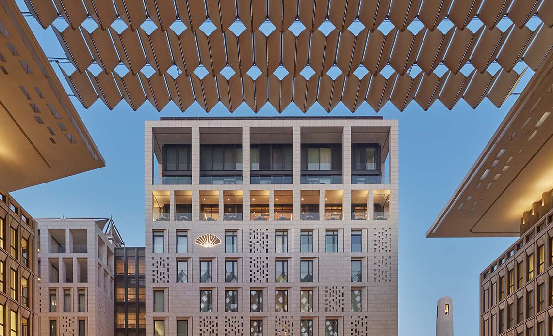 Attention to context is embedded in the very architectural fabric of the hotel, which melds together Qatari urban forms with sleek contemporary elements and was conceived by John McAslan + Partners. Again, the interplay between interior and exterior space, public and private, is very much key, in keeping with traditional Qatari architectural principles, such as the central courtyard around which the hotel’s 117 rooms, 41 suites and 91 serviced apartments are arranged. The shaded passageways and open colonnades, which allow for protection from the beating sun, are inspired by traditional sikat alleyways and Qatari homes, working with the natural environment rather than against it to balance the interplay between light and shadow.