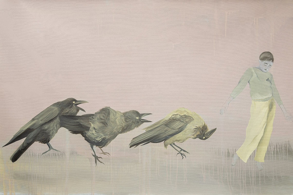 Amina Yahia. يا غراب، انت زعلان مني؟ (oh crow, are you upset with me?). 2025. Oil on canvas. 88 x 138 cm © Amina Yahia