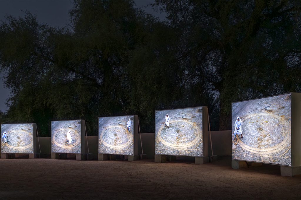 A short cart ride away, the heavy thrums of Rafael Lozano-Hemmer’s Pulse Canopy (2025) resonate across the oasis, quietening only for the calls to prayer and releasing a soaring canopy of light synchronised to the heartbeats of its visitors. In a nearby courtyard, he also scatters streams of Arabic calligraphy across the ground that disperse and regroup with each footstep.
