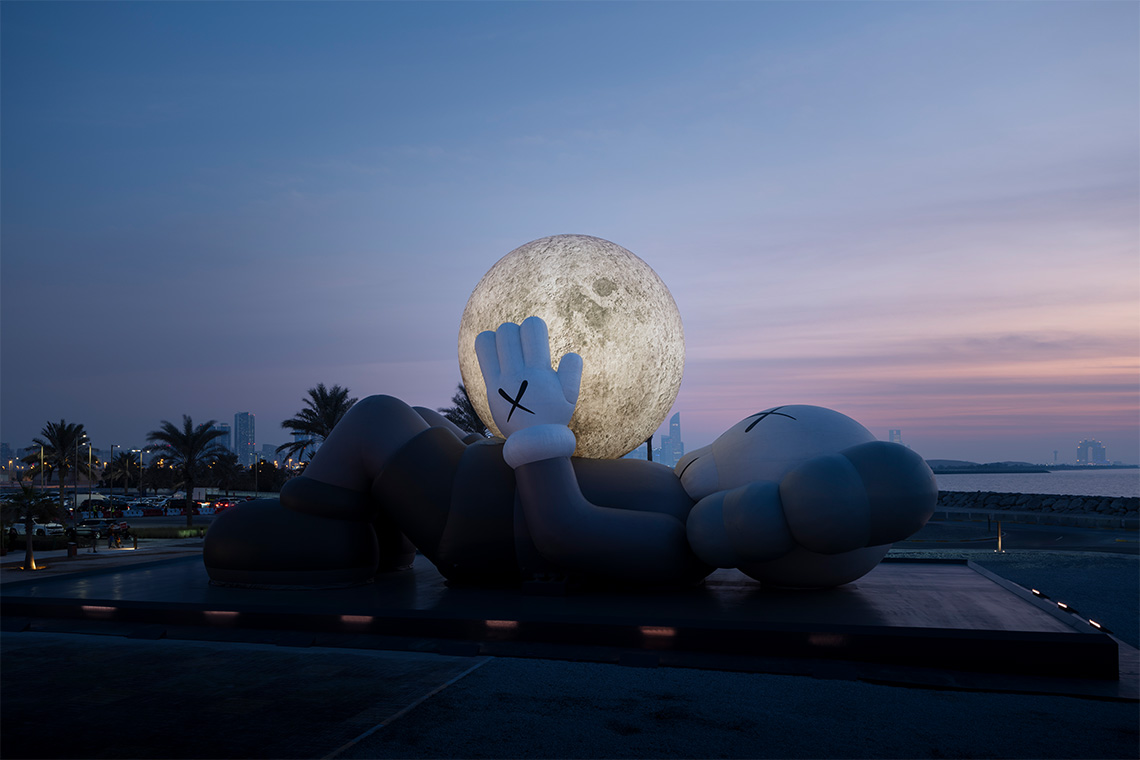 Along the harbour – and with the city’s glistening skyline held at a distance – one of the works lays a 32-metre-long character from another world on his back, cradling a giant luminous moon. It is the very Instagram-friendly KAWS: HOLIDAY Abu Dhabi (2025), created by Brooklyn-based artist KAWS with an engineered steadiness that keeps the moon afloat with uninterrupted continuity. Its colossal presence opens up the curatorial thinking of artistic director Khai Hori, for whom the moon and its shifting phases have served as a conceptual anchor – a “celestial guide” and “the world’s original light source” – for its poetic charge, attunement to natural cycles and guiding of civilisations across land and seas since the start of time.