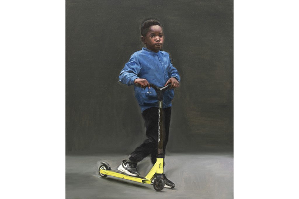 Across the way from Olivia, Garçon sur trottinette (2024) is, per the wall text, modelled after Édouard Manet’s L’enfant à l’épée (1861), which is not part of the collection. (Hamdad often visually quotes Old Masters, but subtly and freshly representative.) In situ, the young boy’s portrait is placed next to Fernand Pelez’s three-panel Grimaces and Misery: the Entertainers from 1888. The leftmost panel features a lineup of street children, limply fatigued or impatiently crossing their arms or glaring pointedly. The fragility of childhood feels heightened between Hamdad’s quiet boy paused alone in the frame and the relentless circus in which Pelez’s youth are forced to partake.