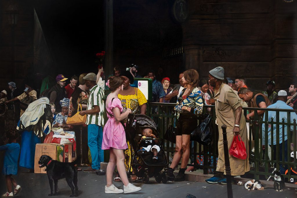 On other side of Lhermitte’s Les Halles is Rive droite (2021), which also feels like a synergistic glimpse at disparate lives, highlighting that miraculous urban alchemy whereby people cohabitate despite their differences. Rive droite is especially powerful because it specifically depicts Barbès Rochechouart, a metro stop to the north of Paris that functions as an entry point into a sector of the city with a significant African population. The people depicted at the mouth of the metro are heterogenous in age and race; there is graffiti on the wall, corn being grilled in a shopping cart and trash on the street. It is an area of the city that tourists and even other Parisians do not usually visit (in 2015 it was deemed part of the ‘no-go zones’ by the alarmist American media). To give Barbès Rochechouart pride of place is to celebrate its residents and neighbourhoods over the parts of Paris that are considered more illustrious. Nearby, Hamdad’s Paname (2025) further explores this neighbourhood in a way that feels almost orchestral in its arrangement – a mêlée of colors (pink dress, red plastic bag, yellow wax fabric), figures (child, musician, seller) and activities (mercantile and popular).