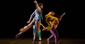 Dressed in vibrant hues of lilac, yellow and turquoise, dancers leap, roll and extend their…