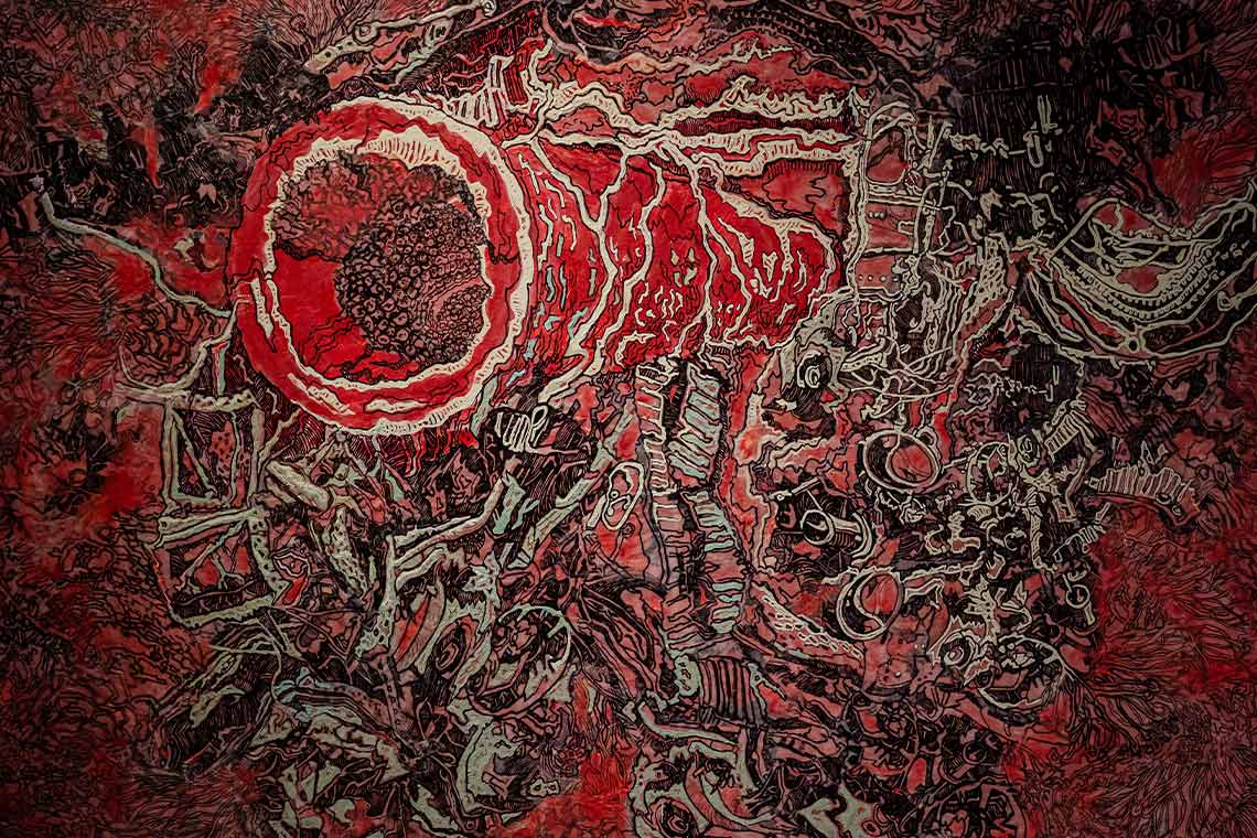 Simrin Mehra Agarwal. War Machines- III. 2024. Detail. Graphite, charcoal, ink, acrylic, mineral powder, primer, plaster, gypsum powder, stucco, gesso, glue, sand, fibre-glass and paper on wooden panels. 122 x 153 cm. Image courtesy of the artist