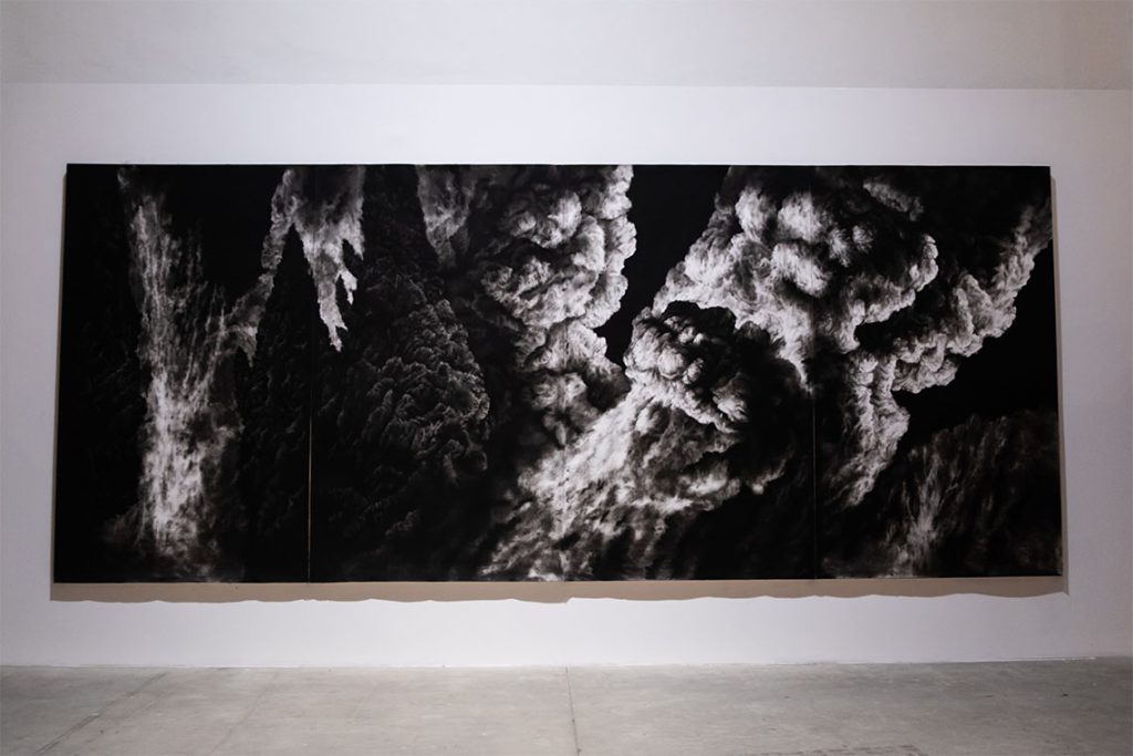 Destruction is also explored through Afram Chamoun’s Power Station (Jiyeh) (2025). Working across oil on canvas and a pencil drawing sketched onto the wall, Chamoun’s works are based on a power station destroyed in 2006. The painting, permanent and static, contains a rumbling presence, pointing to the massive size and strength associated with the station. In contrast, the sketch undercuts this sense of vitality. Soft grey pencil strokes, which will inevitably be erased, point to the fragility and vulnerability inherent in destruction. A few steps away, Black Cloud (2016) by Abdelrahman Abo Lela hammers the point home. Photographs depict the plumes of smoke created by the burning of rice straw in the Nile Delta of Egypt. Here, fire is a helpful short-term destructive force that gives way to a deadly slow burn in the form of latent, pervasive health issues for local communities.
