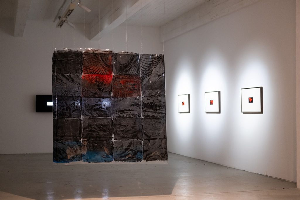 Upstairs on the mezzanine level, the latent and charged nature of slow burn turns further inwards towards bereavement. Tamara Kalo’s The only body capable of holding our world’s grief (2025) is made up of a lumen photograph stretched across 20 tiled sheets of paper. Exposed over three days, the piece captures the shifting passage of sunlight across the corniche of Saida. Fragmented and ablaze with light, the sea is depicted as the only space large enough to contain collective grief. Nearby, a mixed-media installation of acrylic on nylon sheets hangs from the wall. The interplay of light and shadows illuminates certain aspects: a crab, an olive tree and a phoenix come into focus against blazing flames. Curiously alive with movement, collective loss and mourning appear as an interconnected force of reckoning in Tala Asmar’s Where the Sea Was (2025).