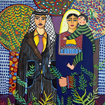 As for the woman—my companion in many of the artworks—she is my grandmother, my mother, my neighbors and the women I love. Woman is like the earth, as many poets, artists and lovers describe her, but in my paintings she is far more than that. She is not just land; she is homeland and shelter. She is the lady of the universe—she is the universe itself. I feel her presence and her greatness in the folds of the dress I paint with utmost care to honor her; plants, flowers and patterns become ornaments for a beautiful face that looks upon you with love.