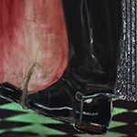 Sport imagery and apparel is a key motif in the recent work. Growing up shy yet physically taller than her peers, Nadar recalls discovering confidence through athletics—what she describes as the moment of “finding her shoulders.” In her early teens she imagined rowing for the Egyptian national team, a daydream that gives the exhibition its title. The painting I Saw Myself Playing on The National Team references this imagined future: hand-drawn pastel stripes in red, white, black, gold and green evoke the immediacy of a flag, while the phrasing of the title suggests a desire for belonging that remains unresolved.