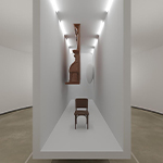 The installation, originally conceived for MAM São Paulo’s Glass Room, was adapted to occupy an entire room at the Institute, creating an architectural intervention that alters the perception of space. In Limiar [Threshold], the artist brings together three suspended elements: a chair from the Móveis Cimo factory, used in Brazilian immigration offices in the 1950s; a 19th-century Belgian Catholic church stool, a testament to the colonial circulation of sacred objects; and Cradle, a white, cocoon-shaped sculpture that suggests origin, absence and the potency of future. Gathered in the exhibition room, these elements create a sensitive space that invites reflection on identity, exile and belonging. More than representing historical narratives, the installation proposes an immersive and poetic experience in which the visible and the invisible intertwine.