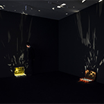 Attia transformed three similar suitcases into sculptural installation works, which provide a tangible experience of the powerful symbolic abstraction that these items have on our psyche. Each suitcase lays open and is filled with shards of broken glass, brightly illuminated in a manner that casts sparkling reflections onto the walls. In these sculptures, Attia invites viewers to gather around that which has been shattered—and that which reflects. The shattered mirrors and their reflections materialise the traces that the suitcases carry as memories. These mnemonic traces are at once abstract, diverse and unpredictable—they are the ghosts that make us what we are, individually and collectively.