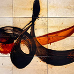As art critic Abderrahman Benhamza writes: “An eminently plastic element, Cherkaoui’s letter, isolated and centered, appears—at least initially—as a performed and effective ‘artefact’. A binary palette (red and black) defines it, enriched by nuanced shades of saffron-tinted or orangey greys. Cherkaoui has further developed his characteristic approach to lettering, always structured around rhythm, balance, and contrast.”