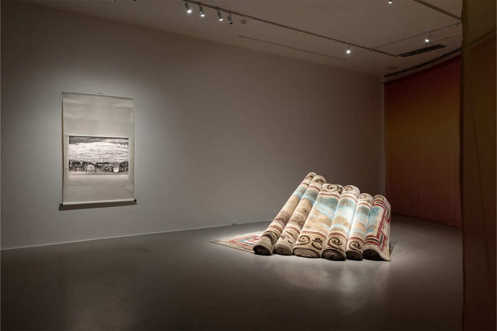 Hera Büyüktaşcıyan’s work, Destroy Your Home, Build Up A Boat, Save Life (2015) brings attention to survival and life in the face of violence and displacement. The title references the Epic of Atrahasis, an ancient Mesopotamian story in which a man builds a boat to survive a flood inflicted by higher powers to punish humans. The work connects land and sea, life and death, loss and strength, and becomes an act to save memories and knowledge during personal or societal disruption. The artist also reflects on the Istanbul pogrom of 1955, when minority communities (mostly Greek) were violently displaced. Resonating with the biennial’s theme of yearning and human persistence, the rolled-up carpet becomes a symbol of home to be easily moved and carried away in quick departure or, on the contrary, to be laid down to set new foundations elsewhere.