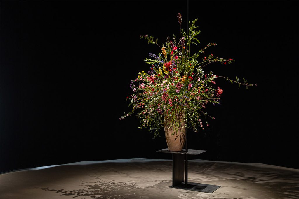 One of the gallery spaces opens to Omar Mismar’s Still My Eyes Water (2025), where a floral arrangement is set against the backdrop of black curtains in an unnerving yet opulent display of the type one might see in a hotel lobby or grand entrance. Yet upon closer inspection the bouquet is artificial, in a lifeless stance with no scent and an unnatural, ageless perfection. The work draws from the 1870 book by Swiss missionary Hannah Zeller, Flowers of Palestine, which featured 54 colour illustrations of local plants. Still My Eyes Water becomes a reflection on fading memories, on what is kept alive and who decides.