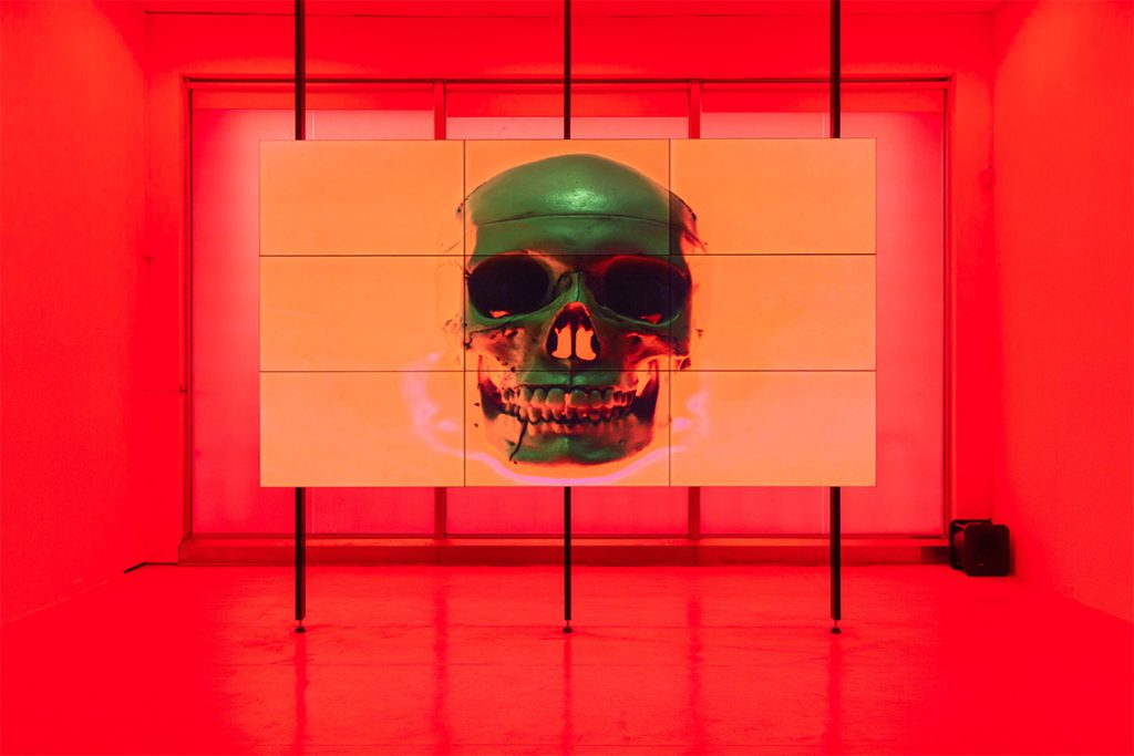 A bright pink-lit room features P. Staff’s Skeleton (2025), a looping video of a human skeleton – sometimes revealed bone by bone – that makes the invisible visible and examines how power structures control or define bodies, and how those often overlooked in society disappear unseen. The work fades in and out of focus, playing on the human desire to be acknowledged and the longing to be included and seen in life and death. Simon Dybbroe Møller’s Bag of Bones (2023) animates an Iron Age-dated naturally mummified body found preserved in a Danish bog. The 3D version is inflated and deflated with artificial breath, connecting the physical with digital representation and, perhaps in a more sinister way, the installation brings the dead back to life, probing who has control over our remains and images when we die? Mohammad Alfaraj similarly reflects on temporality and the capture of fleeting memories through images. Like Tea Leaves in Water (2025) brings together palm sculptures, photography, sand and charcoal writings that contemplate how eventually everything that exists will inevitably change or disappear.