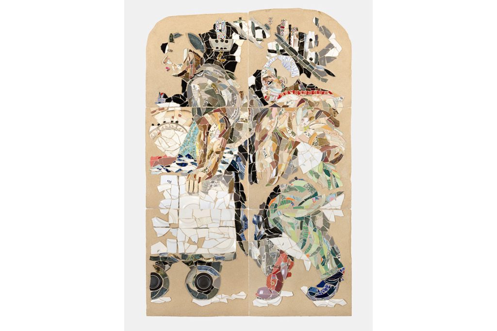 Cairo’s Gypsum Gallery also delivers a two-artist presentation with a joint focus on Alexandria as a city of knowledge, commerce, and pride. Destruction, only to rise anew, anchors Yasmine El Meleegy’s wall reliefs. Their fragmented charm stems from the artist’s utilisation of remnant shards from celebrated 20th century Egyptian sculptor Fathy Mahmoud’s porcelains which El Meleegy transforms into gently chaotic and subtly figurative juxtapositions. Factory workers and fishermen around the Port of Alexandria who were Mahmoud’s subjects reappear in her reliefs as re-evaluated and valued, occupying the surfaces with grand presence. “Both Alexandria and London are port cities historically shaped by trade, migration, and layered cultural identities — cities where commerce and empire have left deep material and psychological traces,” says the gallery director Aleya Hamza. “Through El Meleegy’s reassemblies of Fathy Mahmoud’s industrial porcelain fragments and Marianne Fahmy’s hand-embroidered visions of a relocated Alexandrian population, imagining the submersion of the city, our presentation links the city’s histories of labor, nationalism, and environmental precariousness to broader global patterns of production and displacement.”