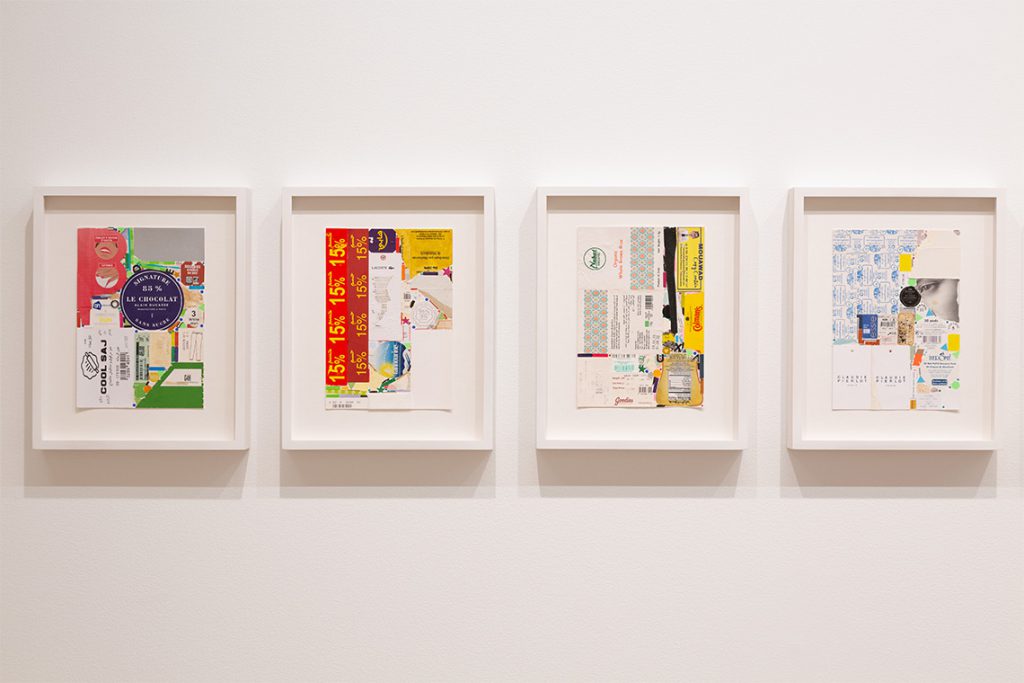 Other works in the exhibition are centred around the artist’s more recent experiences. The 2019 Revolution, Covid-19 pandemic, economic crisis and Beirut port blast – which destroyed Saadé’s studio – led to the artist relocating to France, where she now works from her domestic apartment in Paris. We see her piece together the different aspects of her life in Petits Papiers (2022). A series of seven framed pieces showcase miscellaneous items – maps, stickers, tags from purchased items, flight tickets. Viewers witness the growth of her child as the sizes of clothing tags get ever larger. Elsewhere, receipts depict the price of items changing rapidly, highlighting the deterioration of the Lebanese lira. Through these discarded scraps, Saadé encapsulates the monumental shifts underway in her life during this period.