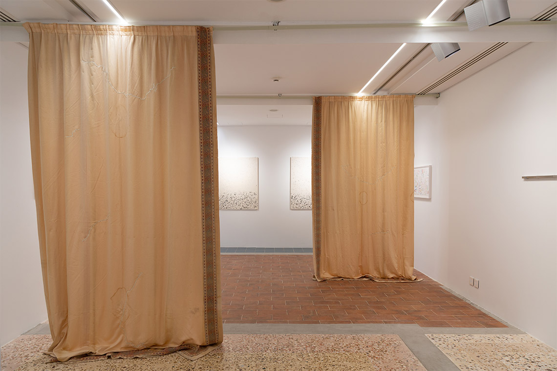 Crossing States is softly broken up by beige curtains salvaged from Saadé’s childhood home. These lay in soft pools across the floor, their fluid materiality allowing visitors to traverse freely. As a result, we at once feel welcomed into a familiar environment, further aiding the idea that we are in the artist’s own home. The curtains are embroidered with sloping, occasionally jagged, white lines. These curving routes represent the 37 trajectories that the artist would routinely take while travelling through Lebanon during and in the immediate aftermath of the Civil War. They map journeys to visit friends, family, the local school and sports clubs. We are faced with a vivid contrast: the benign nature of these everyday trips and the context of the Civil War taking place in Lebanon.