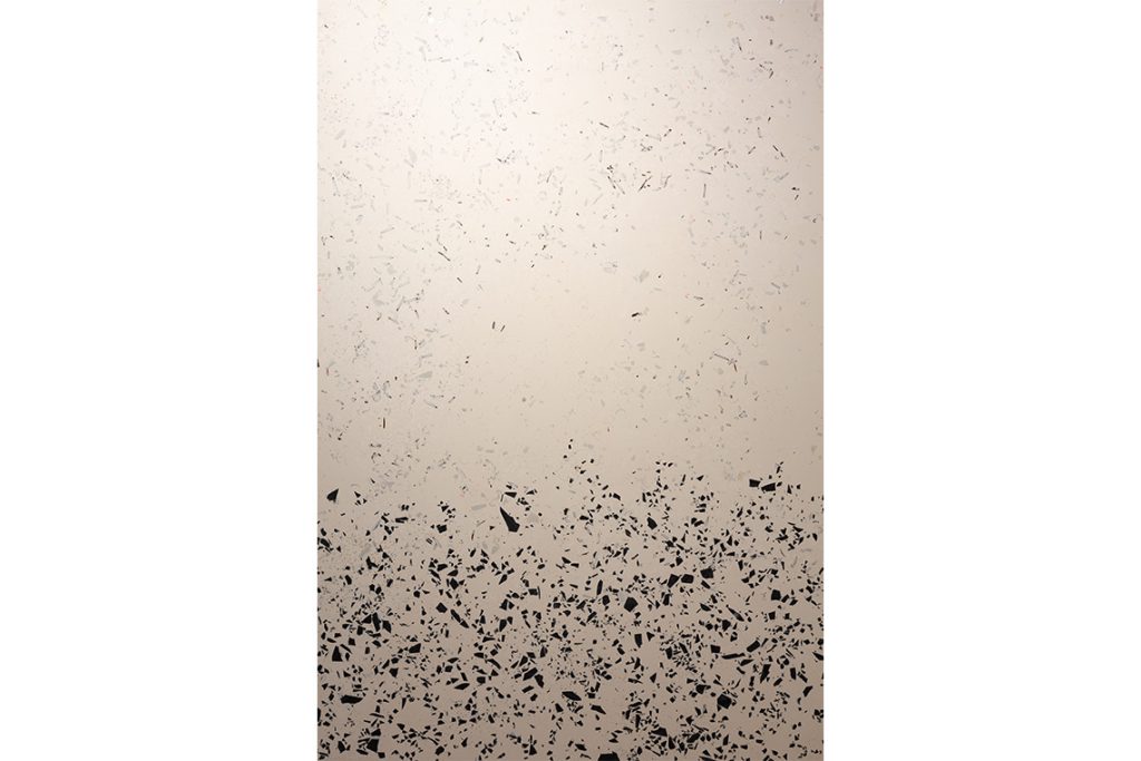 Two separate pieces are suspended above this floor installation as the final part of the Crossing States collection (2024). Here, terrazzo appears again – speckled flecks of black, brown and grey appear jumbled against a harsh white background. Made by combining a cement base with a mixture of ground materials, terrazzo is either poured by hand or pre-cast in blocks. In both scenarios, one cannot control how the ground materials will fall. The random pattern of the terrazzo seems to point to the lack of control that one can often feel in periods of crisis.