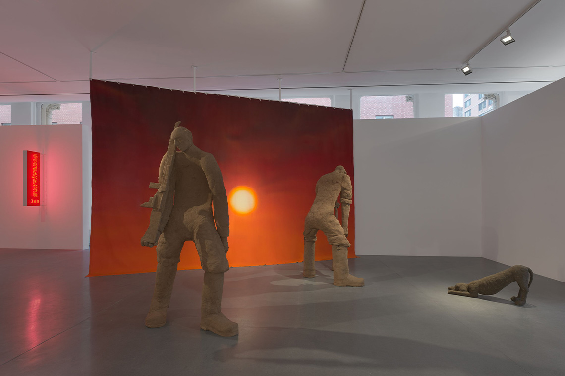 A solemn return to earth is a lingering search in Cherri’s practice, most physically in his clay sculptures of life-size or larger-than-life figures, which often negotiate between being an exhausted soldier or an aloof bestial creature. The Paris-based Lebanese artist’s spectral figures, such as the show’s layout of two gargantuan soldiers and a timid dog entitled Wake up Soldier, Open your Eyes (2026), are spectral in their detached interiority. Pensively looking down, the fighters drop their shoulders as they hold onto their remaining will to serve. The burden of their weapons has worn them down as much as their contemplation of each step. A large print of the sun backdrops the juxtaposition, heating the soldiers and the stretching canine with its blaring stillness. The fiery dusk paints the corner where the installation is perched into an orange blare, bearing a desert-like barrenness which also spills into a long stretch of drawings on the opposite wall. Overall entitled To Save What Can Be Saved (2025), the disarming illustrations of soldiers in repose possess a diaristic rawness and immediacy that feels both reactionary and shy.