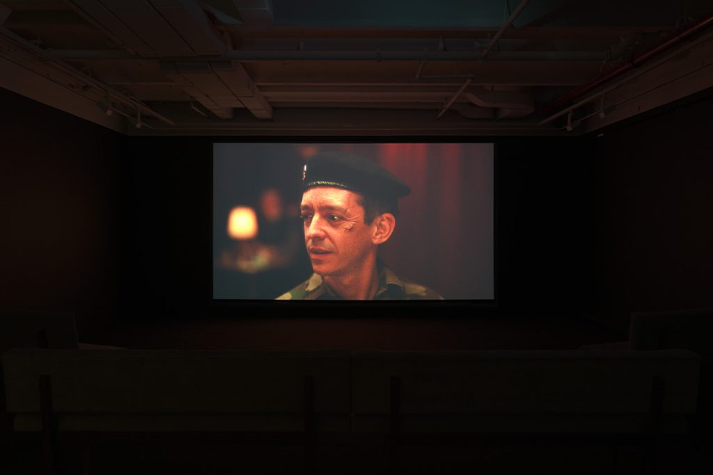 The alchemic heft of Cherri’s clay sculptures and the subtle marks of the drawings on paper lend themselves to a similar potential of loss. Les (Sur) Vivants (2025) is a neon text sculpture which plays with the French words for “the living” (les vivants) and “the survivors”, the work’s title. The simple differentiation by the addition of sur ridicules the grandiosity of being alive and coming out as not dead from a war. Towards the back of the gallery, two bronze masks with bothersome laughters usher the viewer to the basement, where Cherri exhibits his latest film, The Sentinel (2026). The 29-minute-long sequences trace a young big-eyed soldier whose injury leads him to leave his place of duty. Along the way, he encounters the show’s large sculptures, like an alien sighting, and ends up at a basement bar named Les Survivants. There, a bar singer leaves the stage to point out to the soldier the locale’s odd lanterns, which are none other than the haunting masks across the gallery. Leaving the gallery’s basement feels not unlike the soldier’s eventual departure from the gloomy bar, devotedly heading back to his duty. The iron-heavy call of his military obligation is embodied in yet another face hung above the staircase. Chuckling with menacing eyes and a widening mouth, it swallows the light with its monstrous appetite.