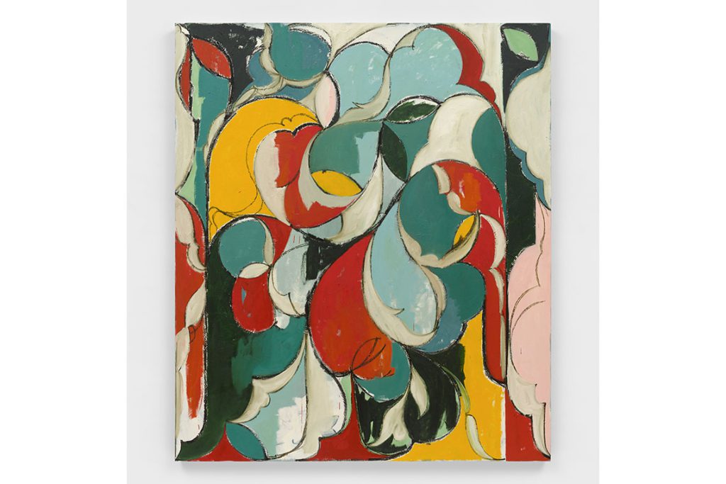 Here, Aram leaves behind the grid system which often grounds his petal-like motifs. Now unrestrained from an encapsulating geometry, the floral elements spring freely across the surface and grow with autonomy. This new path also yields a pliability in the artist’s handling of an abstraction which nods to Islamic ornamentation traditions, as well as to the refusal of a Western eye to rationalise the visual codings of these motifs. Untethered swollen shapes linger and mingle, rubbing with one another in an abundance that signals an art historical confrontation. A freed painterly hand shatters the expectations of control and self-erasure; the anticipation of a rigid finale also crushes down with each painting’s subjective growth in lieu of any rigid network.