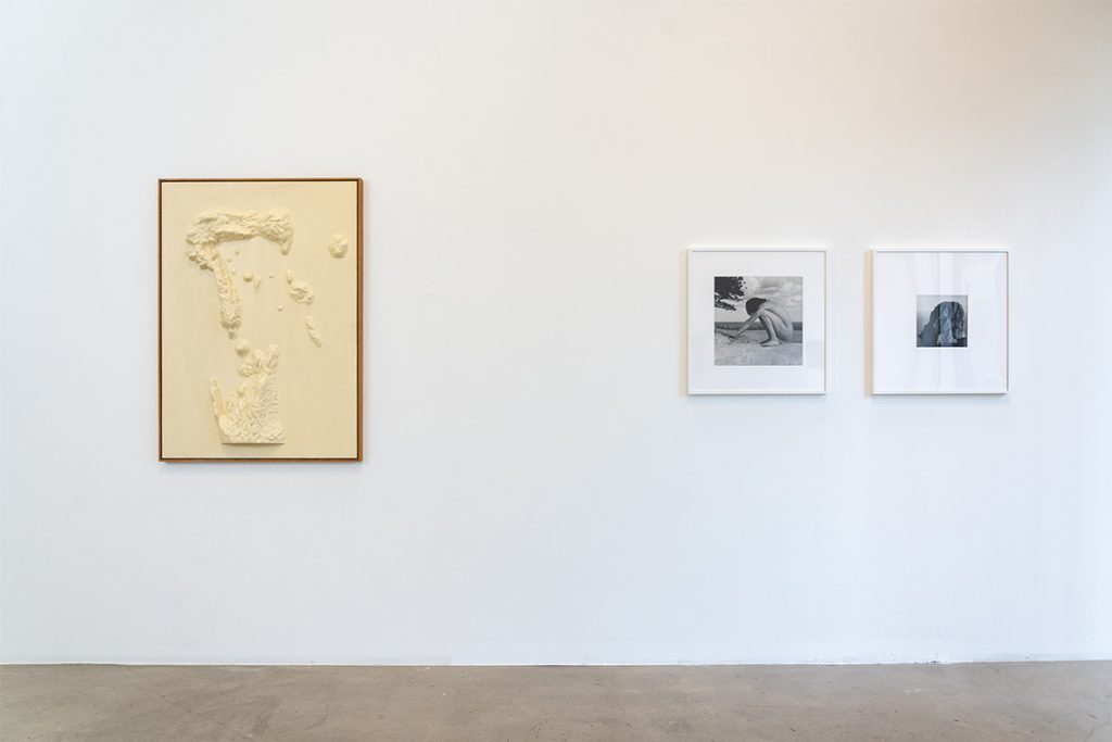 Elsewhere, contrasts continue to accumulate. Olivier Millagou’s Peinture Périmée (Rose) (2023) depicts a hand holding a rose, rendered in acrylic and expired expanding foam. The image feels faintly melancholic and forms part of the artist’s Peinture Périmée series, which uses animals, flowers and insects as symbols of the fragility and irreparable damage of the Anthropocene. These themes are compounded by Robert Mapplethorpe’s Lisa Lyon (1982), presented courtesy of Galleria Franco Noero. Depicting a nude woman in a downward pose, head turned inward and hair obscuring her face, the work conveys a sense of introspection. Meanwhile, Joanne Burke’s Festival 7 (2025), a wall-mounted bronze sculpture, glitters in opposition. Delicate lashings and indentations catch the light, producing a surface that oscillates around Burke’s fascination with transformation.