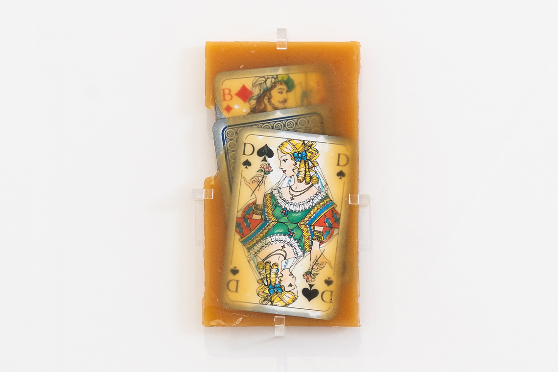 Today, Marfa’ 10 honours this network directly, bringing together works consigned by 18 galleries from around the world. The resulting exhibition celebrates not only the endurance of Marfa’ but also the collective structures that have sustained it. This spirit of cross-cultural exchange is immediately evident upon entering the space. Seta Manoukian’s What is the Best Way (2024) features two acrylic paintings, each one depicting vibrant mountains rendered in pinks, blues and greens. Anchoring one wall, their luminous palette creates a sense of calm. Nearby, Alvaro Barrington’s We Be Jammin, North Star, G (2023) pulls visitors in an entirely different direction. Bottega Veneta leather and other fabrics are stretched tightly across a painted steel pan, forming a precarious star-like structure that evokes improvisation and tension. Paola Yacoub’s Jeux de Guerre (2025) disrupts the narrative further, presenting skat playing cards, their French suits encased in wax. The gesture is subtle yet charged, transforming objects associated with leisure into sealed relics embodying strategy and chance. By placing artists from different geographies and generations side by side, Asseily creates a distinctly collaborative atmosphere. The space becomes shaped by density and heterogeneity. Rather than centring a singular narrative, the exhibition instantly foregrounds interdependence.