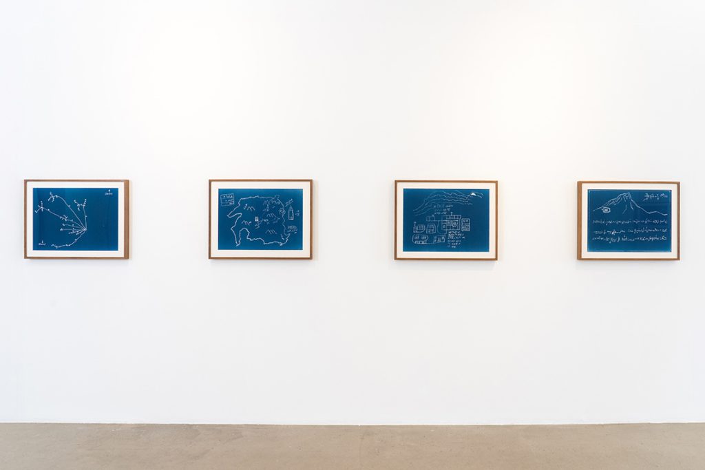 Original hand-drawn maps are thus central to Avakian’s exhibition. The series titled Treasure Maps for Haunting Landscapes I-XVII (2025) exhibits 17 historical Armenian maps collected by Avakian. The pieces have been reproduced as cyanotype on cotton paper, with etchings, symbols and writing appearing white against a solid blue background. Upon entering, visitors are first confronted with Treasure Maps for Haunting Landscapes II to their left. The work is peppered with comprehensible symbols – some resemble huts or small dwellings, another appears to depict a small church. Treasure Maps for Haunting Landscapes III contains a series of trees depicting a forest or woodland, while a graveyard nearby is filled with headstones. In Treasure Maps for Haunting Landscapes XII we can make out two chickens pecking at some grain and a cow drinking from a body of water – both intelligible markings that likely point to the presence of a farm. These images, nodding to scenes of domestic and village life, preserve the memory of these ancestral towns. Suspended in time, the maps act as a tool of remembrance and point to the extent of Armenian dispossession in the face of Turkish violence.