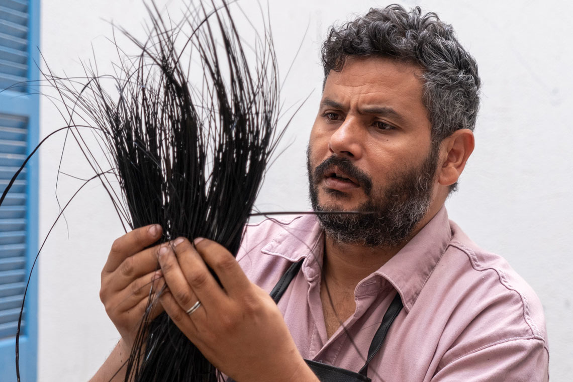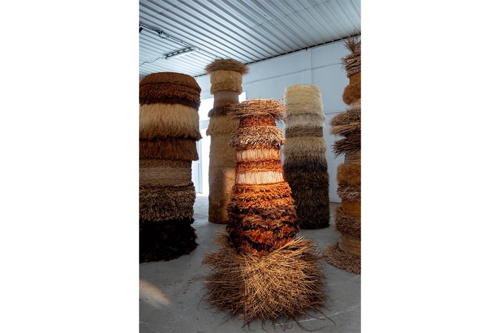 I try to find solutions with artisans and farmers. My team and I work with natural materials, taking whatever organic waste is available from the farms depending on the season, treating it and then using it to create the pieces. We use what is available to us based on the time of year. For example, we collect the unwanted pieces of palm trees thrown away by farmers after they have harvested the palm hearts. From these discarded parts, we can create works like NAR WE JOMMAR (FIRE & HEART OF PALM) (2023), which are five large woven sculptures created using materials from the oasis that would otherwise be considered useless. As a vast number of palm trees have disappeared since colonial times, it is even more important to work with what is still here.