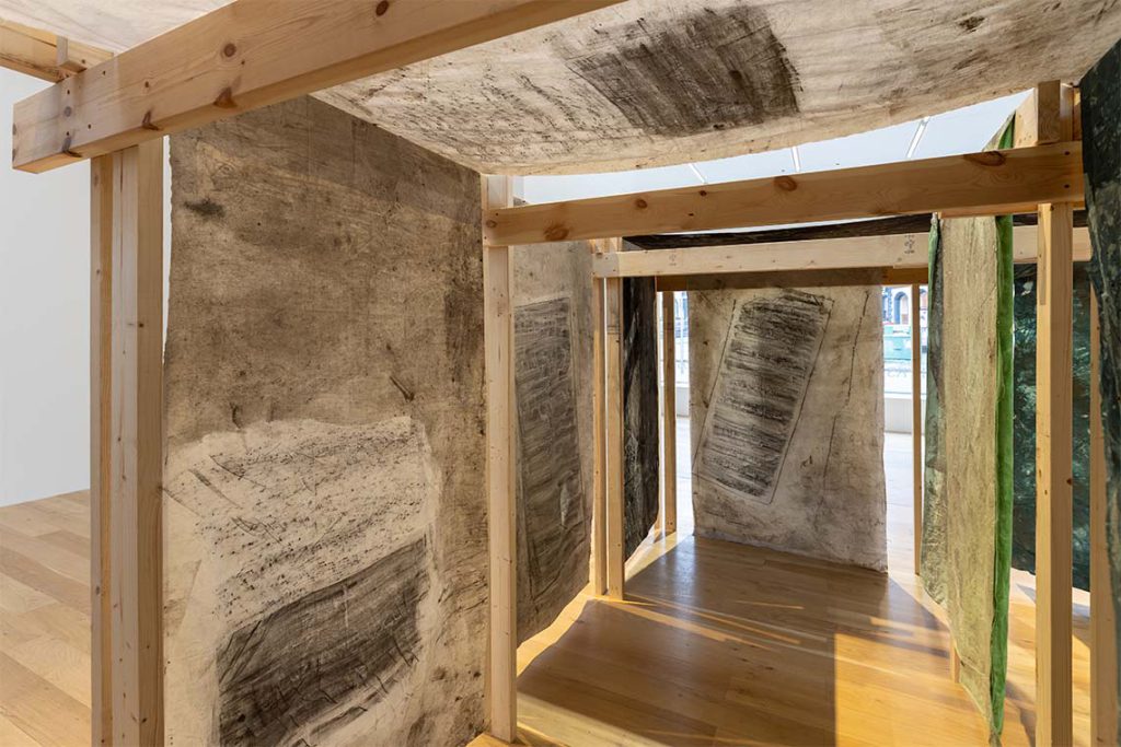 People speak in hushed whispers upon entering the room, as though intuiting something before fully knowing it. The only other sound is the exhibition’s accompanying audio recording, sourced from five cemeteries across Lebanon, according to Katie Simpson, who curated the exhibition alongside Klara Szafrańska. The sand used to etch the names in Arabic on the sheets representing unfound graves also comes from Lebanon, as does the dirt and debris rubbed onto and across the fabric by Nasser in her studio – her way of physically bringing a piece of these resting places into the exhibition space. The effect is both simple and raw. The sheets move gently as one walks by them, as if a gentle breeze from the Mediterranean had passed through, and they hang sombrely yet elegantly from their perches. A closer look reveals the material chaos of the dyed and stretched cloth, with bits of charcoal and dirt affixed to them, bits of place that are inescapable to the eye.