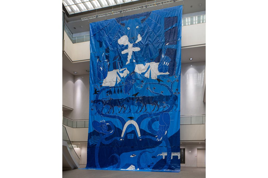 The connection to water is a strong thread through other works in the arts centre. From John Akomfrah’s Vertigo Sea (2015), a three-channel video merging histories and narratives as the sea operates as a space of both beauty and fear, to Mulyana’s crocheted installation, Between Currents and Bloom (2019–present), drawing attention to the severe water pollution in Indonesia and its impact on marine ecosystems, and Koretsune Sakura’s After Efflorescence: Awakening the Whale Beneath Us (2025), which brings together local myths, memories and histories between whales and humans in Aichi.