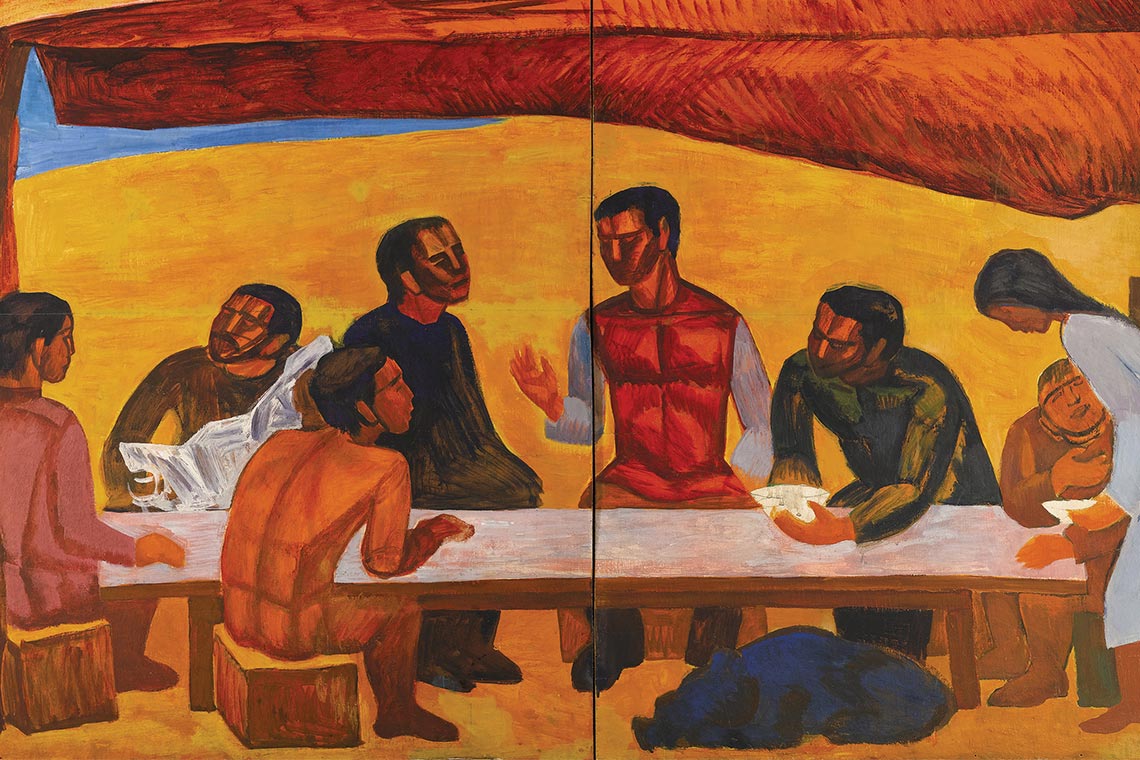 Enhanced by excellent interpretation via wall-mounted panels in three languages, the show unpicks a range of hidden stories, skilfully weaving together key themes in the last century of Central Asian cultural history, from folklore and landscape to transnational solidarity and modernist aesthetics. Seminal pieces include Aisha Galimbayeva’s Shepherd’s Feast (1965), celebrating themes of hospitality and celebration as seen through women’s eyes, and Salikhitdin Aitbayev’s On the Virgin Lands. Lunchtime (1960s), depicting a moment of rest (and a meagre lunch) during the Soviet ‘Virgin Lands’ campaign which brought volunteers to cultivate the Kazakh steppes and displaced thousands of people. Other standouts are Sakhi Romanov’s On a Visit (1967), humorous and dynamic in equal measure, and Warrior by Maktum Qisamedin (1973), a stunning linocut that speaks to enduring themes of strength and resilience that emerge across the whole show. Qonaqtar marks a notable public debut for many of the works on display.