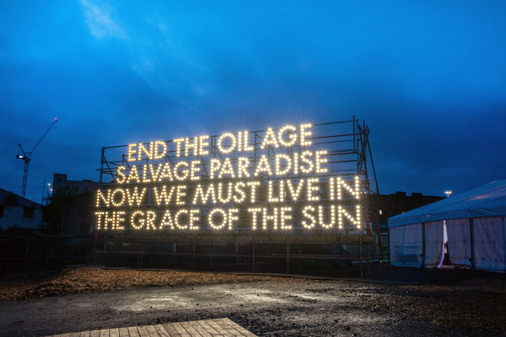Robert Montgomery. Grace of the Sun. 2021. Little Sun solar-powered lights. Installation view at COP26. Image courtesy of Octopus Energy and MTArt Agency. Photography by Philip Volkers