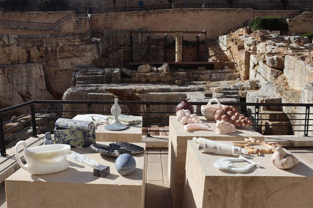 Over at the Roman Baths archaeological site, 21 designers were tasked with creating sculptures and installations out of marble for the show Of Water & Stone, curated by Nour Osseiran, and inspired by themes of ritual, healing and memory. Egyptian artist and designer Omar Chakil presented a purely conceptual installation, Memory Upcycle, featuring 700 stone capsule boxes filled with medicinal salt and thyme, streaming down the staircase like a river – recalling the rivers that were once connected to the baths by aqueducts, and the healing properties of water and salt.