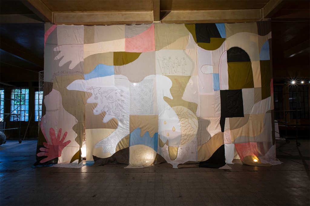 One of the exhibitions, Threads of Life, took over the Abroyan Factory, a 1930s industrial textile factory that was left to deteriorate in the 1990s. The show is all about celebrating and preserving Lebanon’s fading traditional textile crafts, and finding ways to revive the medium. Illustrator Ahmed Amer, who usually creates lively yet minimalist line-drawing artworks, crafted a monumental textile mural in collaboration with several artisans. Entitled Textured Love and composed of layered panels of deadstock fabrics that have been dyed, patched, embroidered and stitched into a collective composition, the piece was draped over a rafter and between two columns. “Each frame carries a unique Levantine or Aghabani embroidery motif, fusing traditional craftsmanship with my personal artistic language shaped through Beirut,” Amer explained. “Individually, the frames embody values, moments and phases, symbols of memory, resilience and transformation. Together, they form a single, large-scale drawing that breathes with revival, hope, comfort, and belonging.”