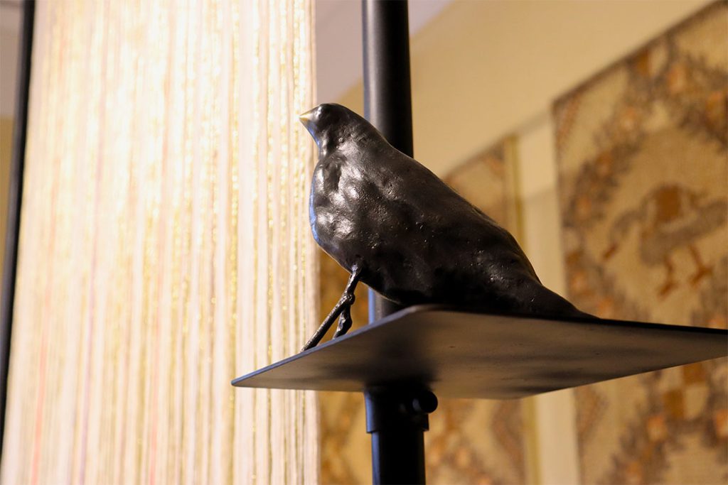 Artist Sara Badr Schmidt, represented by Saleh Barakat Gallery, created Page Blanche, a textile artwork accompanied by a poetry piece and bronze statue of a bird. White, purple, blue, red and gold threads were hung in a metal frame, with each colour symbolising a different part of Beirut’s identity. Purple evokes ancient wealth and Phoenician dyes, while red references the various wars and unhealed trauma. The sea was represented by the blue thread and gold echoed the sun and the Lebanese people’s enduring light. The white was a blank page, open to reinvention.