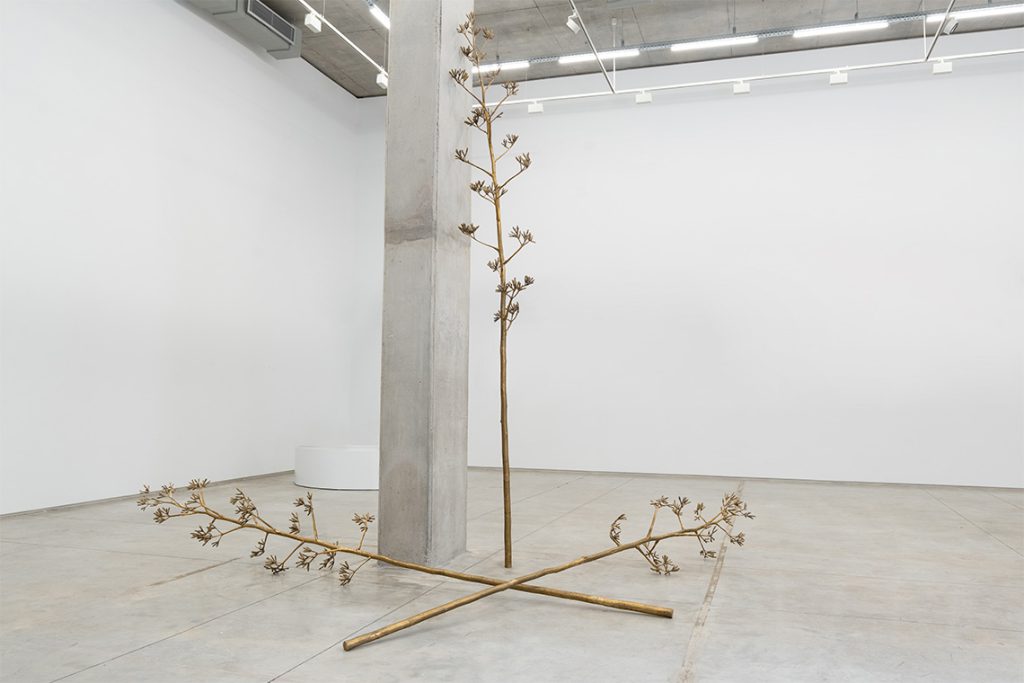 Bouhchichi’s Vegetal Man (2025), in a similar shimmering brass cast, expands on these themes further. Central to the space, the sculpture consists of three agave stalks. The plant, which dies directly after flowering, sows seeds in its wake – and with them, life begins anew. Ideas of collective survival, sacrifice and transformation are cleverly introduced.