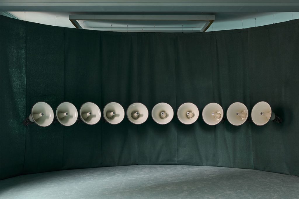 Joe Namy’s Cosmic Breath is a sight-specific installation and reimagined for Ibraaz’s Musalla, a space dedicated to spiritual practice as both lived experience and creative expression. Composed recordings of the adhan, the Islamic call for prayer, from different times and places, the work distributes these voices across horn speakers inspired by those found on mosque minarets. Each emits a separate call, forming a dispersed yet connected sonic field that intensifies at prayer time. Drawing on recordings from Makkah, Jerusalem, Singapore and other cities, including London during the COVID lockdown, the installation traces the movement of sound across histories and geographies.