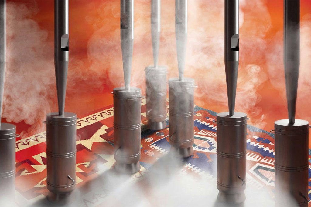 In their latest participatory large-scale installation at Museo Jumex, Slavs and Tatars centre a traditional container used to warm up and pour tea, the samovar, at the heart of the gathering space they have created. Widely used across Russia, Central Asia and Türkiye, the samovar serves as an emblem of hospitality and of communal coming together. Gathering people around this shared ritual, Samovar Swell provides a quiet moment of respite from the world, not through silence but through sharing a cup of tea with one’s neighbours. The installation further comes to life through a series of interventions, both performance and sound-based, that place multilingualism at the heart of human exchange.