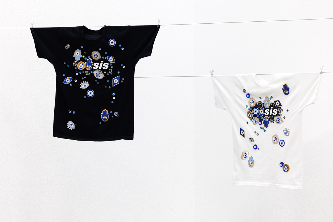 YES, BUT, NO, AND. Four small words, pinned like decisions that refuse to resolve. In her solo exhibition The Task of the Mythologist at Carbon 12, artist Anahita Razmi stages a field of suspended meaning, where objects hesitate between protection and branding. Installed along the left corner of the gallery, a pair of cotton T-shirts hang lightly, as if draped to dry, floating between presence and absence. Their surfaces are densely stitched with evil-eye motifs, transforming everyday garments into something closer to hand-crafted talismans than commercial apparel. The symbol is immediately recognisable – the Nazar Boncuğu, a traditional Turkish amulet placed at thresholds to ward off envy, jealousy and ill intent, normally meant to protect. Here, the motifs are multiplied and shown in various forms across fabric that simultaneously evokes domestic care and the impersonal logic of mass production. In OASIS #1 and OASIS #2 (both 2026), the displacement amplifies Razmi’s ongoing interrogation of significance – protection becomes pattern, rituals become ornament and cultural significance is refracted through both T-shirts, Razmi creates a tension between 1990s rock mythology and Eastern protective symbolism.