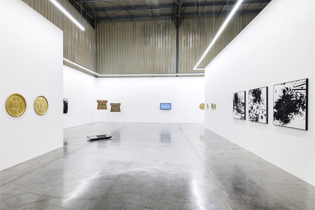 Alongside, two Islamic talismanic shirts are pinned in a similar way to the Oasis T-shirts, hung in the corner like fragments of ritual caught in a moment of stillness. The buttons reading “YES”, “BUT”, “NO” and “AND” cluster together like whispering voices, leaning into one another, murmuring and folding meaning among themselves. While earlier iterations of Razmi’s Talismanic Polarities series (2021–) paired these buttons with pop-cultural or political references, here the historic qualities of the shirts themselves are questioned, in terms of where they came from and the histories they carry. Their interpretations are fluid rather than fixed.