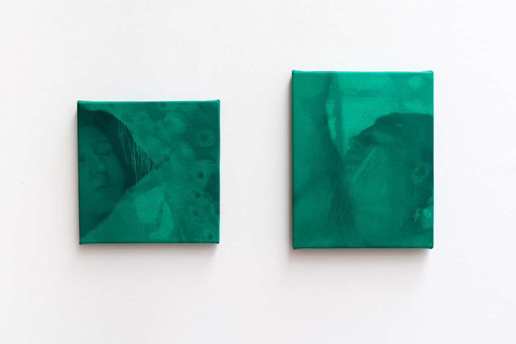 We see only the faces of two sleeping figures (apparently in the same bed, but divided in our gazes) in Iranian-born artist Fa Rizavi’s small and eerily beautiful Untitled (2025) paintings. These, too, are difficult to forget. One reminds me of the sneaky pictures you take of a loved one while splayed out in their sleep, so you can show them the next morning for a laugh. But Rizavi’s paintings are quiet and haunting, suffused in the artist’s signature emerald green, somehow with the soft grainy feel of CCTV footage. The peace of sleep, of deep rest, is tinged with a disturbance that makes me pause longer at the work.