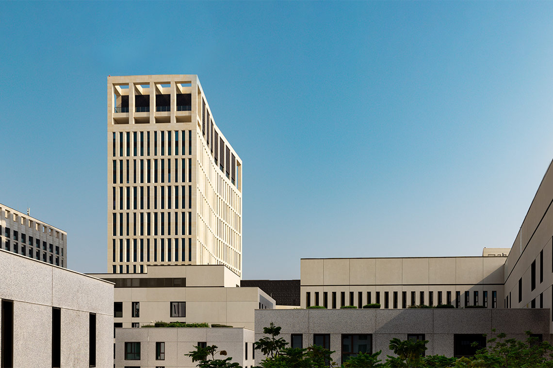 Rising within the dense urban fabric of Msheireb Downtown, Park Hyatt Doha makes an immediate impression by its height. At 21 storeys, the hotel soars above from the district’s predominantly low-rise buildings, with floor-to-ceiling windows reinforcing its presence while opening the interior to views of the surrounding neighbourhood. This prominence is set within one of the world’s first fully sustainable downtown regeneration projects, where contemporary urban planning, walkability and continuity with local history frame both the building’s architectural presence and its design strategy.