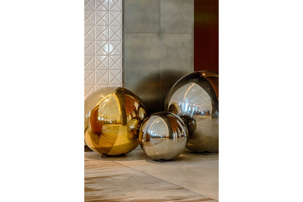 Art and cultural references are woven into the interiors of Park Hyatt Doha with measured intent. Works selected by the Association for Modern and Contemporary Art of the Arab World are embedded within the hotel’s spaces, where the use of mashrabiya patterns and henna motifs introduces contrast and orientation within the broader architectural framework. The various pieces reference key moments in Qatar’s cultural history, from maritime livelihoods and geological forms to the emergence of the modern city of Doha. In the reception, The Pearl consists of three reflective pearl-forms that capture light and draw attention to the hotel’s welcoming arrival area. Rather than simply illustrating heritage, the art operates alongside material choices to construct a layered but seamless narrative of the place and its context.