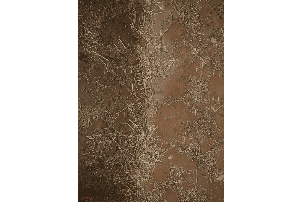 El Dessouki’s works reveal that blood quite literally – using the keen edge of a razor blade he opens up slits in his Earth Paintings to reveal their blood-red underpaint. Yet, as with all his work, this subterranean effect operates on a deeper level still. He explains the specificity of the imagery through two points of inspiration. Firstly, the quotation “If the earth is thirsty, we will irrigate it with our blood”, taken from Youssef Chahine’s film Al Ard (1969) set amidst the 1930s struggle between peasants and landowners, and furthermore an image from Mikhail Sholokhov’s Nobel Prize-winning novel And Quiet Flows the Don, in which, after civil battles in 1920s Russia between the Reds and the Whites, Cossack riders galloping over fresh battlefields would churn up blood and gore from beneath long grass with their horses’ hooves.